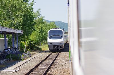 側線では富良野ラベンダーエクスプレスの列車が停車中。